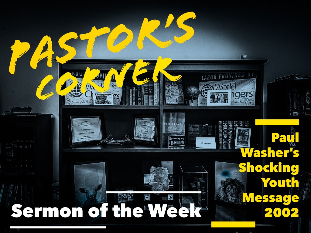 Pastor’s Corner: Sermon of the Week August 11, 2021August 11, 2021 / B&D+5 In this week’s Pastor’s Corner: Sermon of the Week, we go back in time to 2002 in Montgomery, Alabama. Paul Washer delivered a truly unforgettable sermon. Our very own Landon Key was present and forever changed. Share this: Share on X (Opens in new window) X Share on Facebook (Opens in new window) Facebook Like Loading... Related